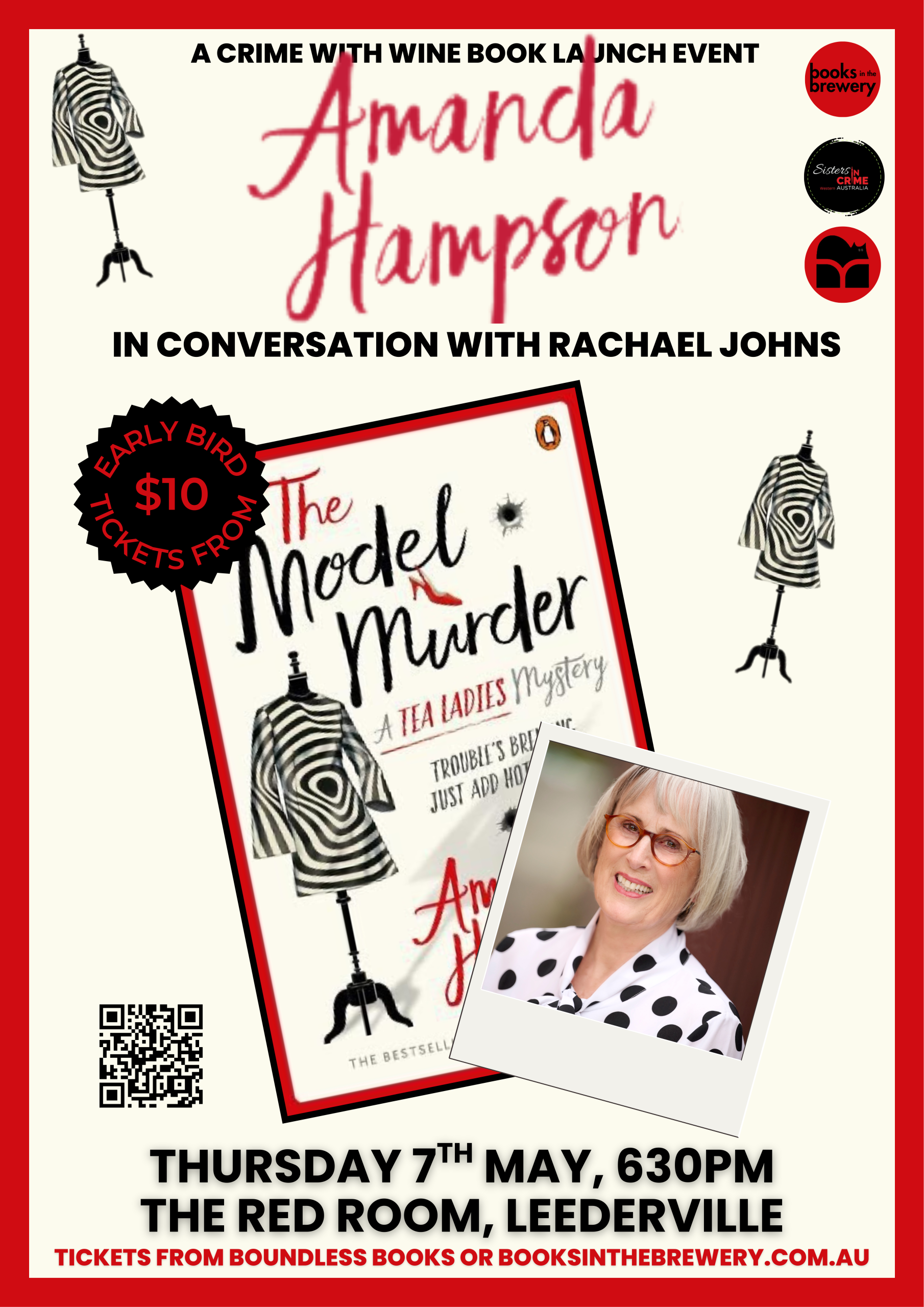 Perth: Sisters in Crime WA presents Amanda Hampson in conversation with Rachael Johns, to launch Amanda’s new eagerly awaited book, The Model Murder. A Crime with Wine event, at The Red Room Leederville. Presented in conjunction with Books in the Brewery. Book here.